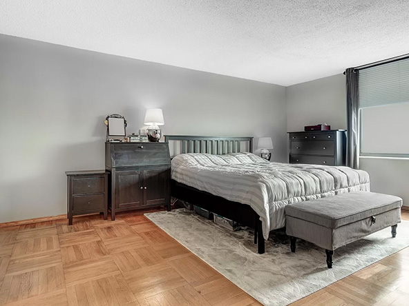The master bedroom has a walk-in closet and a bathroom with a double vanity. The second bedroom is next to a fully renovated bathroom. The unit features parquet flooring, central air conditioning, and an in-unit washer and dryer. A parking space is included.